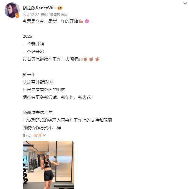 2月4日,演员胡定欣发文宣布离开TVB,她在文中表示:“新一年决定离开舒适区,自己去看看外面的世界,期待有更多新尝试、新创作、新火花。感谢过去这几年TVB及邵氏的经理人同事在工作上的支持和照顾,即使合作方式不一样,但支持还是依旧。”